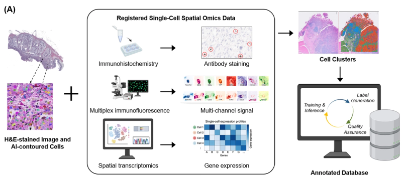 Figure 1. How single-cell labels are generated in digital pathology. H&E paired with one of three spatial omics modalities, producing cell clusters and an annotated database to train on. Each modality brings its own systematic biases..