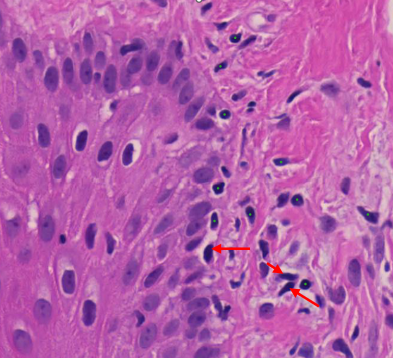 Figure 2. Labeled (green dots) versus unlabeled-but-similar (red arrows) cells in a single H&E tile. The model has no way of knowing the arrow-marked cells belong to the same class.